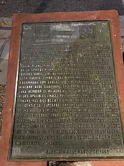 The initiative towards the erection of this monument came in 1988 from the Senator for the Federal District Fernando de la Rúa (Unión Cívica Radical), though the draft law expired before being treated in Congress.[4] As Chief of Government of the City of Buenos Aires, in 1998, De la Rúa - who was to become President of Argentina on the next year - proceeded to realise this belated project of his, inaugurating the square's fountain with the presence of Hovhannes Bedros XVIII, the Armenian Catholic Catolicos-Patriarch of Cilicia, and Vartán Waldir Boghossian, the Catholic Bishop for the Eparchy of the Armenians of Saint Gregory of Narek in Buenos Aires, and the attendance of notables and residents of the neighbourhood.