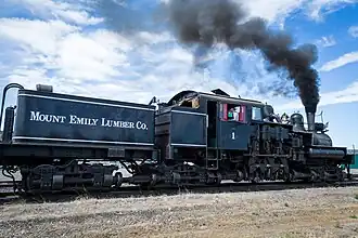 Since the beginning of the Mount Emily Lumber Company, logs were transported down the mountain behind a Shay steam locomotive on a short line railroad. This practice was common in the logging industry until the development of more powerful log trucks and better logging roads. Mount Emily owned four Shays, and after Valsetz bought the company and began hauling with trucks, one engine was donated to the Oregon Museum of Science and Industry. From there it was donated to the Oregon Historical Society, and through a lease agreement the Shay is operated by the City of Prineville Railroad.[21]