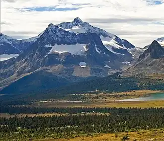 Mount Erebus is a 3,112-metre (10,210-foot) mountain summit located near the Tonquin Valley of Jasper National Park in Alberta, Canada. Mount Erebus is composed of sedimentary rock laid down during the Cambrian period, then was pushed east and over the top of younger rock during the Laramide orogeny.[2] Its nearest higher peak is Mount Fraser, 4.0 km (2.5 mi) to the northwest.[1] The Continental Divide lies 3 km (1.9 mi) to the west, Angle Peak is situated 4.5 km (2.8 mi) to the southeast, and The Ramparts are 5.0 km (3.1 mi) to the north. The mountain's north ridge terminates at Outpost Peak.