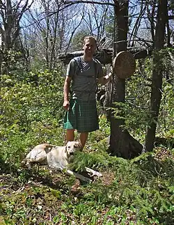 Mount Fitch is the third-highest peak[3] in the Commonwealth of Massachusetts at 3,104 feet (946 m). It is located on the ridge between Mount Greylock at 3,489 feet (1,063 m) to its south and Mount Williams at 2,951 feet (899 m) to its north. The peak sits in the northwest corner of the Town of Adams (originally known as the Town of East Hoosac[4]) in Berkshire County. The forested summit is approximately 123 yards (112 m) due west of a local high-point on the Appalachian Trail. Mount Fitch does not meet the Appalachian Mountain Club's prominence criterion of 200 vertical feet of separation from adjacent peaks as outlined in New England's Four-thousand footers list. Currently there is no side-spur trail or signage directing a hiker to the summit of Mt. Fitch from the Appalachian Trail; however, there is a wooden placard at the summit itself (pictured at right). The top is infrequently visited by hikers due to its anonymity, the bushwhack necessary to reach the top and the viewless summit.