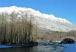 Mount Higgins is a 5,176-foot-elevation mountain summit located at the western edge of the North Cascades Range, in Skagit County, Washington.[3] Mount Higgins has two subsidiary summits, Skadulgwas Peak (4,986 ft) which is the fin-shaped middle peak, and also Mount Higgins Lookout Site (4,849 ft), the western sub-summit. The mountain is set on land administered by the Mount Baker–Snoqualmie National Forest. Mount Higgins is situated along the north side of State Route 530, mid-way between the communities of Darrington and Oso, near the site of the 2014 Oso mudslide. The nearest higher neighbor is Round Mountain, 0.93 miles (1.50 km) to the north-northeast.[1] This mountain is named for Oso homesteader Walter Higgins.[4] The first ascent was made in 1888 by John Higgins, Frank Lawrence, and Al Baker.[5] Precipitation runoff from Mount Higgins drains into tributaries of the Stillaguamish River. Topographic relief is significant as the south aspect rises 4,800 feet (1,500 m) above the Stillaguamish in two miles.