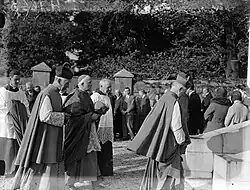 On the feast of St Bernard, 1833, the foundation stone of the new monastery was blessed by William Abraham, Bishop of Waterford and Lismore. It was called Mount Melleray in memory of the motherhouse.[6] In 1835 the monastery was created an abbey, and Ryan, unanimously elected, received the abbatial blessing from Abraham, this being the first abbatial blessing in Ireland since the Protestant Reformation. It was from Mount Melleray that a small colony of monks was dispatched to found the English Mount Saint Bernard Abbey in 1835. Daniel O'Connell supported the endeavor, and visited the abbey in 1838.