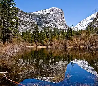 The mountain is named after Carleton Watkins (1829–1916),[3] an American photographer in the 1800s whose photographs of Yosemite significantly influenced the United States Congress' decision to preserve it as a National Park. His photograph of Mount Watkins reflected in Mirror Lake was especially popular, and likely led to his name being affixed to this mountain.[6] This mountain's toponym was officially adopted on June 30, 1932, by the U.S. Board on Geographic Names,[3] although it was featured in publications as early as 1871.[7] The Native American name for the mountain is "Waijau" which means Pine Mountain.[8][9]