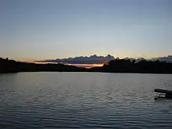 Mountain Lake is situated in southern Adirondack Park in Bleecker, New York. It is located just west of Great Sacandaga Lake. The lake was called Carpenter's Lake in the 19th century. The lake contains one small island, Elmer Island, located towards the western end. There is a dam on the northwestern end of the lake. Its outlet flows into Vandenburgh Pond. During an era of economic prosperity with leather and glove manufacturing in the local communities, the lake was a popular resort area for people of Gloversville and Johnstown in the late 18th and early 19th centuries. There was at one time an electric train line that ran from the northern end of Gloversville up Bleecker Mountain to a station at the lake for vacationers. This line was owned at one time by the FJ&G RR Co.