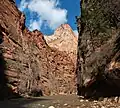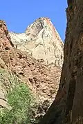 Mountain of Mystery is a 6,565-foot (2,001 m) Navajo Sandstone summit located in Zion National Park, in Washington County of southwest Utah, United States.[4] Mountain of Mystery is situated above The Narrows, towering over 2,100 feet (640 meters) above the floor of Zion Canyon and the North Fork Virgin River which drains precipitation runoff from this mountain. This peak rises above Orderville Canyon on its north side, and Mystery Canyon on the south. Its neighbors include Mount Majestic, Cathedral Mountain, Observation Point, Cable Mountain, Angels Landing, and The Organ. This feature's name was officially adopted in 1934 by the U.S. Board on Geographic Names.[4] The first ascent via the Northeast Buttress was made 15 September 2001, by Brian Cabe and Tom Jones.[5]