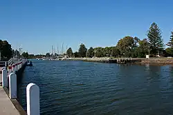 ![]() The wharves and harbour on the Moyne River at Port Fairy | |