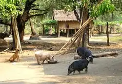 Before the start of a new taungya cultivation, the villagers collectively buy two goats, and two fowls are gathered from each household. One of the goats is put in front of the hut closest to the stream and the other near the second hut. The fowls are then placed in between the two huts. After the villagers pray for good health and the abundance of crops for the coming taungya cultivation, both the goats and fowls are slaughtered one after another starting from the goat nearest to the stream. The blood of the animals is then sprayed over the small huts and the flowing water. The villagers then cook the goats and the fowls are reclaimed by their respective owners. With the meat and khaung, they make an offering to the nat before they begin the feast. Meanwhile, the village is shut down for three days and the villagers fix up bamboo arches over the village path. If anyone enters the village during this time period, a compensation has to be paid to cover all the expenses incurred. This ceremony is celebrated once a year and after the ceremony, they can start their taungya cultivation for the year.[21]