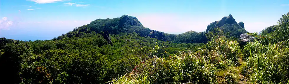 At 1,614 metres (5,295 ft) above sea level, Mount Timpoong is the highest peak of Mount Mambajao. Mambajao is the central and largest of the island's three volcanic mountains (the others being Mount Catarman and Mount Sagay, also known as Mount Guinsiliban). Mount Mambajao's other peaks are Mambajao Peak at 1,568 metres (5,144 ft) above sea level, and an unnamed peak with an elevation of 1,529 metres (5,016 ft). It has flank vents located on Campana Hill and Minokol Hill.[4][1]