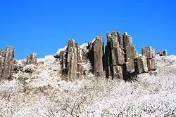 Mudeungsan (Korean: 무등산) is a mountain in South Korea. It extends over Buk District, Gwangju, as well as Hwasun County and Damyang County in South Jeolla Province. Mudeungsan has an elevation of 1,187 m (3,894 ft)[2] and is a part of Mudeungsan National Park[1] which gained national park status in 2012.[3] The peak of Mudeungsan is named Cheonwang summit, but it has been designated as a protection zone for air force military installations. Therefore the highest spot the climbers can ascend without special permission is Seoseokdae Rock, with an elevation of 1,100 m (3,600 ft).[4]