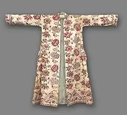 Mughal clothing refers to clothing worn by the Mughals in the 16th, 17th and 18th centuries throughout the extent of their empire. Much of them were already being used in the past centuries before their arrival in Indian subcontinent. It was characterized by luxurious styles and was made with muslin, silk, velvet and brocade.[1] Elaborate patterns including dots, checks, and waves were used with colors from various dyes including cochineal, sulfate of iron, sulfate of copper, and sulfate of antimony were used.