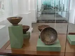 The Muisca were notable for their ceramics production and major production was located close to rivers and lakes. The surroundings of Lake Fúquene formed a principal place for ceramics production, especially in Ráquira and Tinjacá. The Spanish called the people from this region "Pottery People".[33] Other important clay and ceramic producing settlements were Soacha, Cogua, Guatavita, Gachancipá and Tocancipá on the Bogotá savanna and Tutazá, Ráquira, Sutamarchán (Boyacá) and Guasca and Suesca to the north of the flat plains.[34][35] The production of pottery was the task assigned to the Muisca women who produced various ceramics such as anthropomorphic vases, cups and mugs, the typical bowls called múcura, pans, the large pots for salt extraction (gacha) and jars with two, four or six holds. The pots were decorated with colourful paints and stylilised serpent or frog figures.[34]