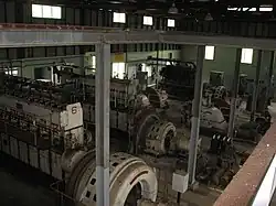 A unique collection of hydro and combustion engines are located inside the power station. They include two hydro-electric sets, both identical GEC Pelton wheel turbines of 144 KW capacity with Boving governor controls. The attached alternators are GEC, three phase with 650 volts output at 600rpm. The maker's plate on one of the turbines reads "Boving & Co. Ltd. London". The writing on the older engine from 1926 reads "Ruston Lincoln England". The generator's makers plate reads "The General Electric Co. Ltd. Witton England".[1]