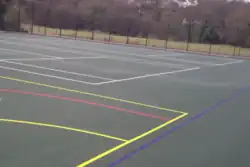 Sports MUGAs usually consist of a combination of a steel goal post and a basketball goal post. This can be senior, junior or match quality for basketball. Sports played on MUGAs are varied, hence the term multi-use. Basketball, football, hockey, netball, and volleyball are usually provided with appropriate floor line markings for each sport, which are lined in different coloured paints. Multi Use Games Area MUGAs are placed into the ground around a sports surface area including natural grass, artificial sports surfaces, sports tiles, tarmac or concrete. Some MUGAs are open-ended, partially closed or fully enclosed. Sizes vary from Key Area 6m x 7.5m. Tarmac key lined. Half Court 7.5m x 15m. Full Court 15m x 30m.