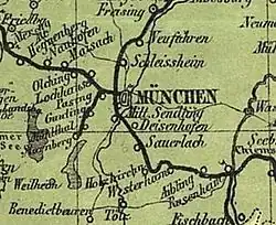The Munich–Holzkirchen line was built as a part of the Bavarian Maximilian's Railway along with the Munich-Rosenheim section of the modern Mangfall Valley Railway. The section between Munich and Rosenheim was designed between 1840 and 1850. The first section from Munich to Hesselohe was built from 1845. The continuation to Rosenheim was originally proposed to go via Glonn and Kirchdorf am Haunpold. After it was approved in 1850, the line was finally built via Holzkirchen. This route modified the plans of 1850 by Joseph Anton von Maffei for the Munich-Rosenheim-Salzburg Railway Company (München-Rosenheim-Salzburger-Eisenbahn-Verein) in order to run closer to the Miesbach coalfields. Construction of the Großhesselohe Bridge began in 1851. When it was opened it was the second highest railway bridge in the world. In 1852, the Bavarian State became responsible for its funding, because the company had got into financial difficulties. The line was completed all the way to Rosenheim in 1857. With the opening of the shorter Munich–Rosenheim railway via Grafing in 1871, the line had less traffic. In 1891, the line was crossed by the Isar Valley Railway that paralleled the Isar river. In 1968 the line was electrified.[2][3][4] In 1981, Großhesselohe station was closed, after several renovations, as the Isar Valley Railway with its Grosshesselohe Isartal station had been fully integrated in the Munich S-Bahn network.