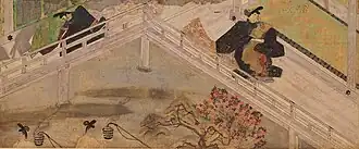 In the top right corner, Murasaki's friend, the maid Saishō no Kimi, is visible.[52] The large garden occupying the left half of the painting and the diagonally positioned building are considered to be a bold scene arrangement.[53] According to Penelope Mason, this is "one of the saddest and most beautiful [scenes] in the scroll", contrasting the beauty of the moonlit garden and pond on the left with the constraints of court life.[52] The latticed shitomi and the stewards separate Murasaki Shikibu from the outside world, keeping her a prisoner in the room.[51][52]