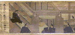 The Hachisuka scroll starts with a description of a banquet given by the queen's majordomo and managed by the governor of Ōmi Province on Kankō 5, 9th month, 13th day (October 14, 1008), the third night of the birth of Atsuhira-shinnō, the later Emperor Go-Ichijō. On that occasion, the mother, Empress Shōshi received presents such as baby clothes and furniture. The illustration associated with this scene shows court nobles on the balconies outside of the principal building in which the queen is located.[30]