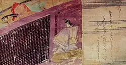 The final illustration of the Hachisuka scroll has no corresponding text section in the extant emaki fragments. However its content can be matched to a scene from the diary in which Murasaki Shikibu expresses her sorrows as a widow[nb 11] worrying about the future. She relates how she is gazing dreamily at the Moon when she is "hopelessly sad" and lonely. Playing the koto (a kind of horizontal harp) on a cool evening makes her even more miserable. This section of the diary also contains a short description of her room containing two bookcases, one with books that her husband had placed there and that no one has touched since, the other with "old poems and romances", likely referring to her own works. This scene is set on an unknown date in Kankō 6 (1009). The illustration present in the emaki[nb 12] shows Murasaki Shikibu inside a tatami room playing the koto with a court lady walking outside her room on the balcony (engawa).[38]