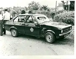On 7 July 1980, three armed and masked men raided the Bank of Ireland in Ballaghaderreen, County Roscommon. The group held staff and customers at gunpoint before leaving with IR£35,000. The Gardaí (Irish police) arrived on the scene but were unarmed and were unable to stop the armed men from escaping in a blue Ford Cortina.[1] The perpetrators were intercepted by a Garda patrol car from Castlerea station with four Gardaí, including Detective John Morley, who was armed with an Uzi submachine gun. The two cars collided at Shannon's Cross, Aghaderry, Loughglinn. One of the raiders jumped out of the Cortina and sprayed the patrol car with bullets, killing Garda Henry Byrne.