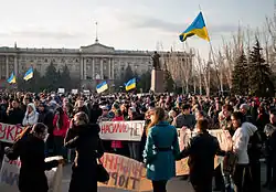 On the morning of March 13, dozens of Mykolaiv residents went to the first rally next to the Central police station.[42] The rally moved to the Prosecutor's Office of the Mykolaiv province.[43] Another protest was held at Lenin Square.[44][45]