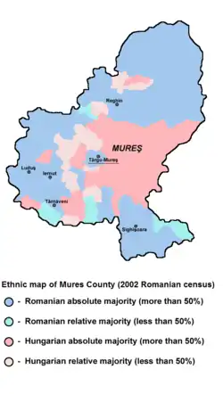 According to the census data of 1930, the county's population was 289,546, of which 45.8% were Romanians, 42.6% Hungarians, 3.9% Germans, 3.9% Romanies, 3.4% Jews, as well as other minorities. By mother tongue, the county population consisted of 45.9% Hungarian speakers, 45.5% Romanian speakers, 3.9% German speakers, 2.2% Yiddish speakers, and 2.1% Romany speakers.[5] In the religious aspect, the population consisted of 32.4% Greek Catholic, 30.3% Reformed, 14.5% Eastern Orthodox, 12.1% Roman Catholic, 3.9% Lutheran, 3.6% Jewish, 2.6% Unitarian, as well as other minorities.[6]