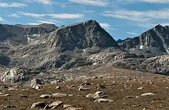 Muriel Peak is a 12,937-foot-elevation (3,943-meter) double summit mountain located in the Sierra Nevada mountain range in Fresno County, California, United States.[6] The true summit is set within the John Muir Wilderness on land managed by Sierra National Forest, whereas the slightly lower south summit is on the boundary shared with Kings Canyon National Park. It is situated one mile northeast of Mount Goethe and one mile south of Muriel Lake. Muriel Peak is the 167th-highest peak in California,[4] and topographic relief is significant as the summit rises 1,600 feet (490 meters) above Muriel Lake.