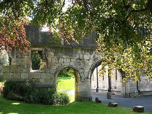 The Hospitium is located between the ruins of St Mary's Abbey Church and the River Ouse, and is thought to have originally been a guest house for visitors to the abbey of low social rank, or possibly a barn.[50] It was originally part of a group of buildings in the abbey grounds that included a brew-house, stables, mill and, near the main gate, a boarding school with 50 pupils. The oldest parts of the ground floor were built around 1300, but the upper storey has been extensively restored in modern times. The ruined gateway at the side dates back to the 15th century, and was probably the entrance to a passage that ran towards the water-gate by the river.[51]
