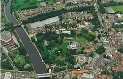 York Museum Gardens cover an area of 10 acres (4.0 ha) on the north bank of the River Ouse, just outside the city walls in the centre of York. There are four entrances to the gardens: on Marygate (off Bootham) by St Olave's Church, on Museum Street by Lendal Bridge, via a path at the side of King's Manor, and from the riverside walk next to the River Ouse. The site slopes gently down towards the river and is made up of historical buildings and undulating lawns interspersed with plants and trees. The gardens are open to the public during daylight hours, so the opening and closing times vary throughout the year. Normally admission is free but there are charges for some events.[7] In 2010 it was estimated that the gardens attract 1.3 million visitors a year.[8] Drinking alcohol, cycling and ball games are not allowed in the gardens.