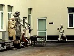 The museum, a branch of the national art gallery,[6] has a display of socialist regime of 45 years (1944–89) period of art symbols and other artifacts and archives with statues in the park.[2] The museum covers an area of 7,500 square metres (81,000 sq ft) in the Sofia suburb known as "Red Star". It consists of three parts: a park in which 77 statues or sculptures drawn from the communist period, including a statue of Vladimir Lenin, have been erected; an exhibition hall with 60 paintings and 25 easel paintings representations; and a media or video hall in which propaganda films and newsreels related to the communist period are screened. There is also a souvenir kiosk where communist period memorabilia are sold.[3][4][7] The museum's collection covers the period from 1944 to 1989, from the introduction of communism to Bulgaria to the end of the totalitarian regime.[3] At the entrance of the museum stands a large "five-pointed star" which had earlier adorned the Party House in Sofia from 1954 to 1984. The statue park, which is said to be the "most representative part of the museum", features statues, busts, and figures of popular communist leaders and activists, of poets, sculptures of Red army soldiers, agricultural and industrial workers, and so forth.[3]