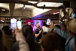 Prohibition of musical performance in the New York City Subway was prevalent since the opening of the first line in 1904.[1] The ban continued under Mayor Fiorello La Guardia, who also made it illegal to perform on New York City streets.[2] Some musicians still sang and played instruments through the 1940s, 1950s and 1960s in an effort to reclaim public space. Finally in 1985, the ban on subway performance was declared unconstitutional following a court challenge by musician Roger Manning,[1][3] and the MTA created MUNY as a pilot program. The program became official in January 1987.[4]