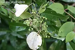 Mussaenda frondosa, commonly known as the wild mussaenda or dhobi tree, is a plant of family Rubiaceae. It is a shrub that grows to about 1.5โ€“2 m (4 ft 11 in โ€“ 6 ft 7 in) tall. Like most other Mussaenda species, they have a bract beneath their flowers, which in this species is white in colour.[2]