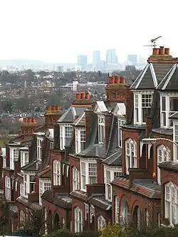 Further down the hill past the Green Man was The Elms, a squat three-storeyed house later improved by Thomas Cubitt standing in 4.5 ha (11 acres), part of the grounds of which were laid out by Joseph Paxton.[11] A short distance down the north side of Muswell Hill was The Grove, which was three storeys high and had nine bays with pedimented projections at each end.[12] It stood in 3.2 ha (7.9 acres) of grounds which contained a 184 m (201 yd) avenue of oaks. In 1774 the house was occupied by Topham Beauclerk.[13] The Elms was demolished in 1900 to make way for Dukes Avenue.[1]