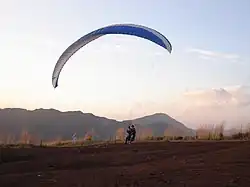 The paragliding at Myōjinyama requires neither registration nor inscription fee. The launch is shallow, thus suitable for novice pilots. The 1 km2 (0.39 sq mi) area can be used for both launches and landings. There is also an additional free landing zone courtesy of the Minami Green Hill Resort in the vicinity of Lake Yamanaka. Other landing areas include most of the coast of Lake Yamanaka and the multiple tennis courts and football fields that can serve for an emergency landing.