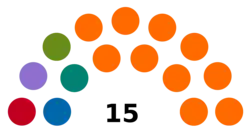 The Assembly elected at the 2019 local government elections, is made up of 15 counselors, with the following party composition:[1]