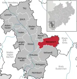 Düren (district)North Rhine-WestphaliaRhein-Erft-KreisEuskirchen (district)Rhein-Kreis NeussHeinsberg (district)AachenAachen (district)BelgiumHeimbachKreuzauNideggenVettweißDürenJülichLangerweheTitzMerzenichAldenhovenHürtgenwaldNörvenichIndenNiederzierLinnich