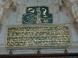 The prayer hall's entrance portal has an inscription panel and a very fine tughra (calligraphic signature) above it. The inscription panel, which consists of four lines of thuluth script, records the foundation of the mosque. The tughra represents the name of Murad III and may have been designed by Nişancı Mehmed Pasha himself.[9] The windows and the two mihrab niches on the rest of the prayer hall's front façade are also topped by inscription panels that quote hadiths (above the mihrabs) and some of the 99 names of God (above the windows).[10] The names of God are also quoted in lunettes above the windows inside the prayer hall, except for the windows on either side of the recessed area where the main mihrab is located; these ones quote a Qur'anic verse, al-Baqara (2:127). The inscription above the main mihrab quotes a variation of another verse (3:39).[10] Additional inscriptions in the dome and semi-domes also quote parts of the Qur'an.[11] One of the gates to the cemetery gardens is also topped by an inscription of a poem by Nişancı Mehmed Pasha.[3]