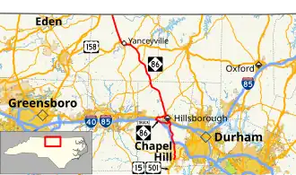 North Carolina Highway 86 (NC 86) is a primary state highway in the U.S. state of North Carolina that runs north and south through Orange and Caswell Counties from Chapel Hill to the Virginia state line at Danville, Virginia. The highway primarily links the towns of Chapel Hill, Hillsborough, and Yanceyville, along with providing a route between Chapel Hill and Virginia. Between Chapel Hill and Hillsborough, NC 86 parallels and serves as an alternative to I-40.