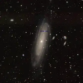 NGC 3200 is a large spiral galaxy located in the constellation Hydra. Its velocity relative to the cosmic microwave background is 3,877 ± 25 km/s, which corresponds to a Hubble distance of 57.2 ± 4.0 Mpc (~187 million ly). NGC 3200 was discovered by American astronomer Edward Singleton Holden in 1882.[1]