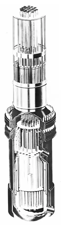 The reactor was de-fuelled in 1975. It was removed and taken to Utah for disposal in November 2022.[11] The reactor was 17 ft (5.2 m) high with a core 62 in (160 cm) in diameter and 66 in (170 cm) high, with 32 fuel elements. Each fuel element contains 164 fuel rods with a stainless steel cladding. Each fuel rod was 1⁄2 in (13 mm) in diameter and housed uranium oxide pellets enriched to an average of 4.4% U-235. The 16 center elements were enriched to 4.2%, and the outer 16 elements to 4.6%. The pellets were 0.4244 in (10.78 mm) in diameter, with pressurized helium gas in the annular space between the pellets and the element walls. Twenty-one control rods were provided, 66 in (170 cm) long, 8 in (20 cm) across and 3⁄8 in (9.5 mm) thick. The rods could be fully inserted in 1.6 seconds by electric drive.[10]