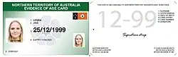 ![]() Both sides of a Northern Territory Evidence of age card | |