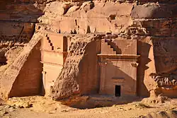 The capital of the Nabataean Kingdom around 312 BC, Petra is famous for its remarkable rock-cut architecture. Located within the Shara Mountains, Petra was home to Dushara, the primary male god, accompanied by the female trinity: Al-'Uzzá, Al-Lat, and Manāt.[2][14] A stele dedicated to the Edomite god Qos is located within the city. The Nabataeans worshipped pre-Islamic Arab gods and goddesses, along with deified kings such as Obodas I. Temple layout and design show influences from Roman, Greek, Egyptian, and Persian temple architecture, with the temples of Qasr al-Bint and the Temple of the Winged Lion serving as examples.[14] The podium within the Temple of the Winged Lion housed the altar, where sacrifices would have been made or the betyl of the worshiped deity.[15] Based on the idols and imagery found within the Temple of the Winged Lion, it is theorized to be dedicated to Dushara.[15] The High Place is located atop the mountains surrounding Petra. Used for offering gifts and sacrificing animals, and possibly humans, to the gods, the High Place consists of a pool for collecting water, two altars, and a large open courtyard.[14]