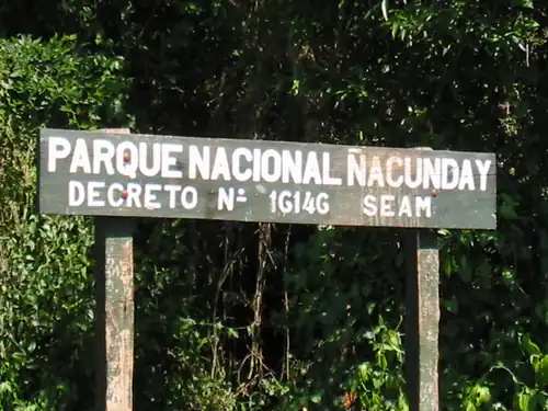 Ñacunday National Park is a national park, located in the district of Ñacunday, Alto Paraná, in Paraguay, situated between the latitude 26°03’ and longitude 54°42’. It covers an area of 20 square kilometres. In the park is located large waterfall - the 35 – 40 m tall and 110 m wide Salto Ñacunday.[1]