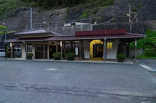 The station consists of an island platform serving two tracks, enabling passengers to change trains. Though managed by the Nagato Railroad Bureau, there are no station staff members nor an automated ticket facility. The platform is halfway up a mountainside cliff, which is accessible via a stairway in a tunnel from the station building. There was a waiting room on the platform, though it was destroyed in a fire in 2000.