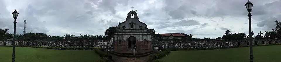 The Baroque cemetery is located two kilometers south of downtown Nagcarlan that takes the shape of a circular cemetery across a 1 hectare property.[1][2] It is surrounded by octagonal stone walls made of red tiles with iron-wrought grills.[6] A façade or arch of about 18 feet high with two iron grill gates leads to a red tiled pathway across a green space leading to the cemetery chapel. The chapel containing a statue of Santo Sepulcro serves as a place for requiem or funeral mass. Located 15 feet below the chapel is an underground graveyard consisting of only 36 tombs arranged in four walls [7] The crypt and chapel is connected by two flight of steps. The first nine steps lead to a Spanish inscription that reads:[2]