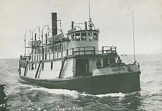 Nahcotta was a steamboat operated from 1898 to 1928 on a route from Astoria, Oregon to Ilwaco, Washington, and then, from 1908 on, from Astoria to Megler, Washington. Nahcotta ran on the same route for its entire service life, and for much of that time was commanded by Capt. Tom Parker, who started his marine career as a deckhand and who had only three months of formal education.