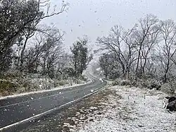 The Mount Franklin chalet was constructed at Mount Franklin in 1938 to service the Canberra Alpine Club.[18] Ski runs were cleared and ski tows were improvised.[19] The club also cleared runs elsewhere, completing a new ski run and jump on nearby Mount Ginini in 1951 - then judged to be the superior slope.[20] Built on leased land, the Mount Franklin Chalet reverted to the Government when Namadgi National Park was created in 1984 and later operated as a museum before being destroyed in the 2003 bushfires.[21] A new shelter designed and built by University of Adelaide students opened in 2008. Today, cross-country skiing is possible in the area when conditions allow.[22]