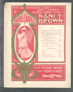 Nancy Brown was created as a starring vehicle for Marie Cahill who portrayed the title role. The name of the character was taken from the song "Nancy Brown" which Cahill sang in the musical The Wild Rose, and which was interpolated into this musical. Cahill also performed another interpolated song, the popular hit "Under the Bamboo Tree" by Robert Cole, J. Rosamond Johnson, and James Weldon Johnson, which she had sung previously in Sally in Our Alley. A new song was written for her for this show by Cole, Johnson & Johnson which attempted to recapture a similar aesthetic to the prior tune, "The Congo Love Song". The show's new hit song, "Two Eyes" also by Cole, Johnson, and Johnson, was sung by the actor Madison Smith (as Hullybaloo) who made his Broadway debut in this production.[1] Other song by this trio of songwriters in Nancy Brown included "Magdaline, My Southern Queen", "My Mississippi Belle", "Save It for Me", "Octette to Bacchus", and "The Soldier is the Idol of the Nation". These songs were published by Joseph W. Stern.[2]