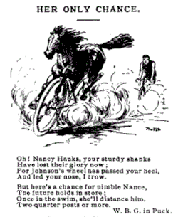 While owned by John Malcolm Forbes, on September 28, 1892, the brown mare trotted a mile in 2 minutes and 4 seconds at Terre Haute's Four Cornered Track with a bicycle sulky, breaking all Sunol's mark of 2 minutes 8.25 seconds set in 1891.[2] Nancy Hanks lost one race heat (in her first start), but was undefeated in her races. She was inducted into the Harness Racing Museum & Hall of Fame in 1955.[3]