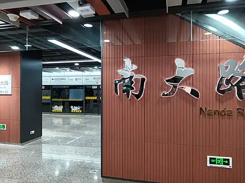 Nanda Road (Chinese: 南大路; pinyin: Nándà Lù) is a metro station on the Line 15 of the Shanghai Metro. Located at the intersection of Qilianshan Road and Nanda Road in Putuo District, Shanghai, the station was scheduled to open with the rest of Line 15 by the end of 2020.[1] However, the station eventually opened on 23 January 2021 following a one-month postponement.[2] It is located in between Fengxiang Road station to the north and Qi'an Road station to the south.