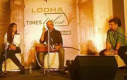Shreya Ghoshal (left) reading and singing Shantanu Moitra's memoirs at Times Litfest event along with Swanand Kirkire (right) on 6 December 2014. The song is composed by Moitra, sung by Ghoshal and written by Kirkire.