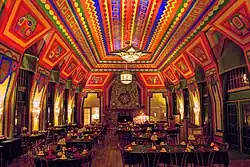 Design elements include architectural features such as polygonal towers, cedar shakes, a gambrel roof pierced by dormers, and French doors topped by sashes with pointed crowns. The Cree theme of the lodge is displayed in the common room, which has a 200-short-ton (180 t) native rock fireplace about 12 feet (3.7 m) high. Inset above the hearth is a native welcome symbol in the shape of a sunburst, made of the same water-rounded stone used in the fireplace. The chamber's walls and ceilings were painted by the artist Antoine Gouffe (who was of French descent and studied art in Paris) with other native-inspired designs[3][5] and have been called a "psychedelic marriage of Art Deco and traditional Cree Indian patterns".[2][8]